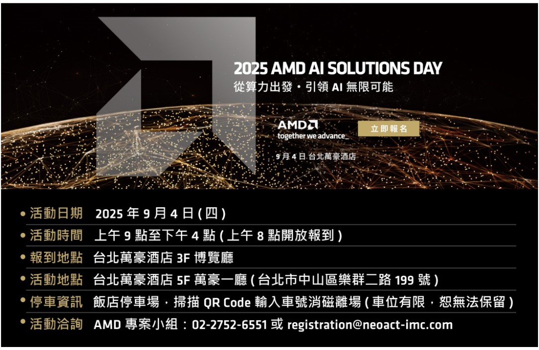 邀請參加 2025 AMD AI Solutions Day,與來自產業、學界與技術領域的領袖共聚一堂,深入交流 AI 發展趨勢與應用實踐。今年活動以「從算力出發・引領 AI 無限可能」為題,活動將聚焦於 AMD AI 發展趨勢與最新產品佈局,並結合來自產學界與業界的重量級講者觀點,共同探索 AI 驅動下的產業變革與技術前瞻。
