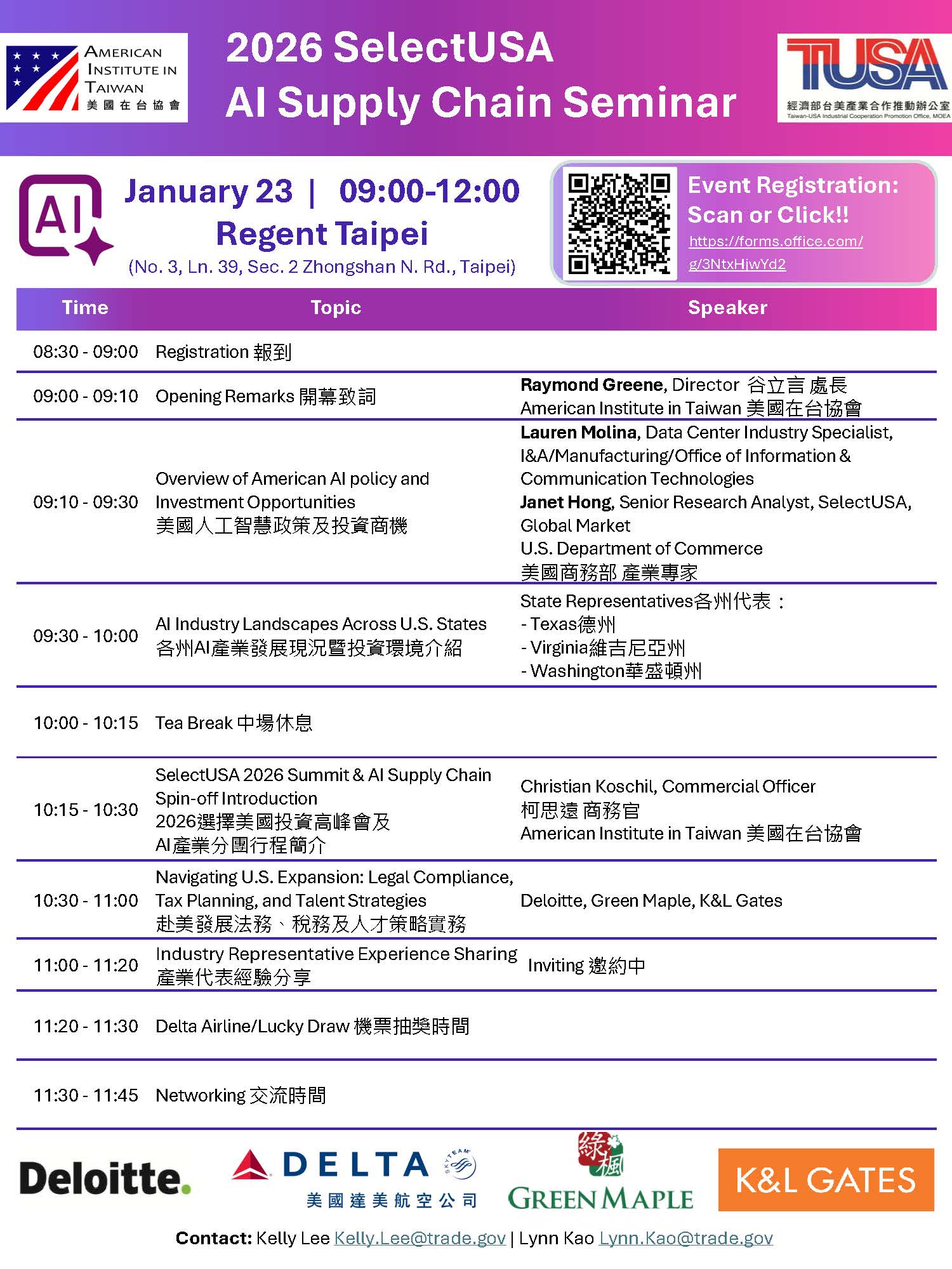 美國在台協會(AIT)誠摯邀請AITA會員參加「2026 SelectUSA AI供應鏈美國市場策略論壇」。
